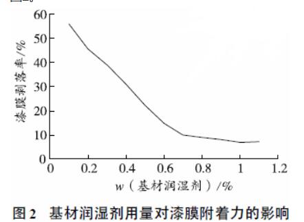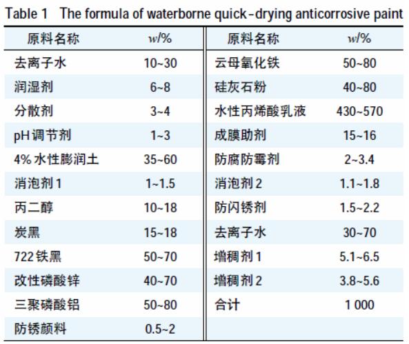 陈焕铭,陈 萍,吴 勇,胡 娟 ( 浙江传化涂料有限公司,浙江杭州 311231) # 0 引言 目前,国外水性树脂的研究技术较为成熟,产品性能也较为稳定,并趋于多功能化、高性能化。但是,国内水性树脂的研发起步较晚,目前产业化的水性树脂较少,一般工业漆用树脂皆以油性树脂为主,国内少数几家企业生产的水性聚酯树脂、醇酸树脂、羟基树脂等皆存在产品性能不稳定、综合性能有缺陷、价格较高的问题,这些问题一直以来成为制约国内水性涂料发展的主要原因。现有的水性防腐漆VOC(挥发性有机化合物)含量偏高,而且干燥速度较慢,一般表干时间需要4 h,实干时间至少需要24 h,更有一些水性涂料产品需要48 h 后才能完全干燥。在工业化生产的今天,有些厂家只能依靠加热进行烘干,这样不仅浪费时间,而且浪费能源。 鉴于上述原因,研究和开发水性快干防腐漆具有特殊的意义。可用水稀释,涂膜具有干燥速度快、耐水性、耐盐雾性好的防腐涂料,既能减少环境污染,又能提升产品的档次,提高企业的综合竞争力。 #1 实验部分 ##1.1 主要原材料 水性丙烯酸乳液、去离子水、防锈颜料、防闪锈剂、分散剂、消泡剂1、消泡剂2、成膜助剂、润湿剂、防腐防霉剂、增稠剂1、增稠剂2、丙二醇、pH 调节剂、水性膨润土、500 目云母氧化铁、改性磷酸锌、三聚磷酸铝、硅灰石粉、722 铁黑、炭黑、防锈颜料。 ##1.2 水性快干防腐漆制备配方 水性快干防腐漆制备配方见表1。  水性快干防腐漆配方 制备工艺:将一定量的去离子水加入至分散缸中,加入润湿剂、分散剂、pH 调节剂、4% 水性膨润土、消泡剂1 和丙二醇,中速搅拌均匀,边搅拌边加入炭黑、722 铁黑、磷酸锌、三聚磷酸铝、防锈颜料、云母氧化铁和硅灰石粉,分散均匀。然后砂磨至细度小于30 μm,转入调漆缸,边搅拌边加入防腐防霉剂、成膜助剂和防闪锈剂。边搅拌边缓慢加入一定量的乳液、消泡剂2 和水,用pH 调节剂调节漆的酸碱度,搅拌至均匀,再用增稠剂1 和增稠剂2 调整到合适的黏度,检验性能合格后,过滤,包装。 ##1.3 水性快干防腐漆性能检测 水性快干防腐漆性能检测结果见表2。  水性快干防腐漆性能检测结果 #2 结果与讨论 ##2.1 水性成膜物质的选择 由于水性环氧乳液价格较高,并且采取双组分施工有一定施工适用期,且含有较多的助溶剂,VOC含量依旧偏高,故选择综合性能较好的单组分水性丙烯酸防锈乳液作为成膜物质。在水性丙烯酸乳液中,与干燥性有关的因素主要有玻璃化温度、相对分子质量和粒径大小等,下面将逐一分析它们是如何影响丙烯酸树脂乳液的干燥速度的。 (1) 树脂的玻璃化温度 玻璃化温度与聚合物的相对分子质量、交联密度有一定的关系,因此直接影响涂膜的干燥速度、硬度、柔韧性,以及涂料的黏度和贮存寿命。一般而言,树脂的Tg(玻璃化温度)越高,涂膜的干燥速度越快、硬度越高,但过高的Tg 会使有些粒子来不及反应就失去流动性,降低涂膜交联密度,影响涂膜光泽、耐水性和耐化学品性,同时树脂的玻璃化温度过高,将导致树脂黏度增大、涂料的适用期缩短。 (2) 树脂的相对分子质量及其分布 随着树脂的相对分子质量增加,涂膜的干燥速度加快,但涂膜硬度下降。因为相对分子质量小的分子链交联成大分子所需的时间,较相对分子质量大的分子链更长,导致涂膜干燥时间延长。高相对分子质量的丙烯酸树脂水分散体所需的羟基含量较低,而相对分子质量分布宽,使得单个小分子链上可能仅含一个甚至不含羟基,干燥后这些低分子链混杂在涂膜中起增塑剂的作用,导致涂膜硬度降低。 (3) 粒径 一般而言,粒径越小,分散体越稳定。粒径较小时,在同样固含量下,颗粒之间的间距就越小,干燥速度就越快,而且粒径小,粒子的比表面积增大,不仅使固化剂分散进入粒子内部的路程缩短,而且在成膜时有利于组分间的相互扩散,提高交联度的同时缩短了涂膜的干燥时间。 选择不同型号的水性丙烯酸防锈乳液,配以相同用量的钛白粉和磷酸锌作为颜填料进行实验,测试水性防锈丙烯酸乳液对漆膜耐盐雾性能的影响,结果见图1。  水性防锈丙烯酸乳液对漆膜耐盐雾性的影响 图1 中的漆膜厚度均在100~120 μm,室温干燥7 d 后放入盐雾箱中,30 d 后取出样板。由图1 可见:国产的8508、719F 两款防锈丙烯酸乳液制成的样板锈蚀比较严重,而采用欧宝迪的2403 防锈丙烯酸乳液制成的样板除划线处锈蚀外,其他位置并无变化。故选择水性丙烯酸乳液2403 为本研究的成膜树脂。 ##2.2 润湿剂的影响 涂料对基材的润湿程度直接影响到漆膜在基材上的附着性能。基材润湿剂用量对水性自干防腐漆漆膜附着力的影响见图2。  基材润湿剂用量对漆膜附着力的影响 由图2 可见:随着基材润湿剂用量的提高,涂膜剥落率不断减小,即漆膜附着力逐渐增强。当基材润湿剂的质量分数增大到0.7% 时,继续提高基材润湿剂的用量,对改善漆膜附着力的作用不大,反而影响漆膜的其他性能,如流平性、耐水性等。由此可见:在水性漆中添加一定剂量的基材润湿剂,有助于漆膜附着力的提高。 ##2.3 防锈颜料的选择 确定水性丙烯酸乳液作为成膜物质以后,防锈颜料及填料的选择至关重要。经过长时间的实验分析,本研究选择了无毒、环保的改性三聚磷酸铝与具有高效防锈性能的正磷酸锌水合物为防锈颜料,并添加少量一种有机缓蚀剂5- 硝基间苯二酸酯锌,提高防锈