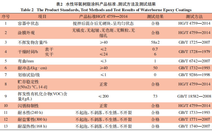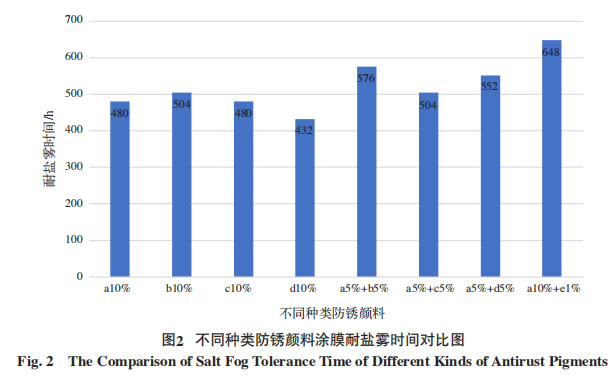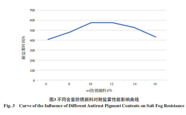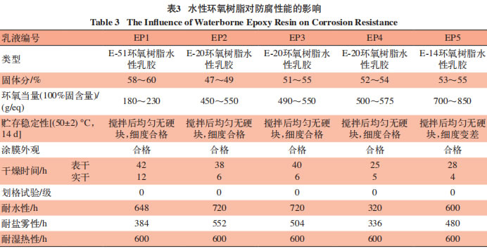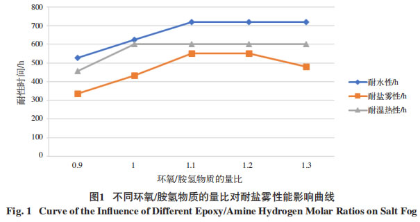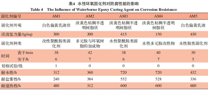#前 言 金属在使用的过程中,受环境中各种因素的影响,会被氧化及腐蚀,不仅造成资源的浪费,还导致其各方面性能降低,带来直接和间接的经济损失。据统计,全球每年因腐蚀造成的损失巨大,金属的防腐已成为不容忽视的问题。利用防腐涂料对基材进行保护的方法,由于其工艺简单、施工便利、重复施工性强等优点,得到广泛应用。 随着经济的发展,环保的呼声越来越高,环保法规也越来越严格,水性涂料成为涂料发展的重要方向之一。水性环氧防腐涂料是以水性环氧树脂作为主要成膜物质,以水为分散介质的一种安全、环境友好的涂料,其VOC含量低,对环境污染小,便于贮存和运输,施工方式与溶剂型涂料相同,已成为涂料工业发展的一个研究热点。但是由于水性涂料具有一定的亲水性,涂膜在干燥后其防腐性能不及溶剂型涂料,导致水性涂料的市场竞争力较差,这给水性涂料的推广带来深远的影响。制备出高防腐性能的水性涂料,是工业领域推广使用水性防腐涂料的迫切任务。 本文采用不同水性环氧树脂、水性胺类固化剂作为成膜物,讨论了水性环氧树脂的种类、水性环氧固化剂的种类、环氧/胺氢物质的量比、防锈颜料种类及用量对水性环氧涂料防腐性能的影响。根据HG/T4759—2014《水性环氧树脂防腐涂料》进行性能测试,对配方进行优化,为实际生产应用提供参考。 #1 实验部分 ##1.1 主要原材料 水性环氧树脂:安邦(EP1)、欣固圣(EP2)、亨斯迈(EP3)、瀚森(EP4)、元邦(EP5);水性环氧固化剂:安邦(AM1)、广树(AM2)、亨斯迈(AM3)、亨斯迈(AM4)、瀚森(AM5);分散剂,BYK;消泡剂,TEGO;防闪锈助剂,海名斯-德谦;氧化铁红,河北;防锈颜料:法国磷酸锌(a)、西班牙磷钼酸锌(b)、广西磷钼酸铝锌(c)、广西三聚磷酸铝(d)、重庆锶铬黄(e);体质颜料,国产;基材润湿剂,TEGO;流变助剂,BYK;去离子水,自制。 ##1.2 实验仪器 JJ500型精密电子天平,常熟双杰测试仪器厂;JSF-550A搅拌砂磨分散多用机,上海普申化工机械有限公司;QSD型刮板细度计,上海天辰现代环境技术有限公司;BAO-250A精密鼓风干燥箱,施都凯仪器设备(上海)有限公司;耐湿热试验箱,sheen;BGD881盐雾腐蚀试验箱,广州标格达实验室仪器用品有限公司;等。 ##1.3 基础配方 根据《水性环氧树脂防腐涂料》(HG/T 4759—2014)标准要求,结合客户施工环境、施工方式、配套方案等要求,确定基础配方,见表1。  水性环氧防腐涂料基础配方 Table 1 The Basic Formula of Waterborne Epoxy Anticorrosive Coatings ##1.4 涂料制备工艺 水性环氧涂料制备工艺:(1)在调漆罐中加入定量去离子水,在搅拌状态下依次加入分散剂、消泡剂,搅拌均匀后再加入氧化铁红、防锈颜料、体质颜料1 500r/min分散20 min直至浆料呈现均匀状态;(2)砂磨机砂磨至细度≤30 μm;(3)将称量好的水性环氧树脂加入成品罐中,搅拌状态下依次加入研磨好的水浆、基材润湿剂、防闪锈助剂,搅拌充分后用流变助剂调节到合适的黏度,过滤待用。 水性环氧固化剂根据计算进行配比使用。 ##1.5 性能测试标准与方法 按照产品行业标准HG/T 4759—2014,对涂料及涂层的各项性能进行测试,测试结果见表2。本实验涂膜耐水性、耐盐雾性、耐湿热性性能检测中,根据客户实际使用需求,样板膜厚为(55±5) μm,且耐盐雾试验采用样板划线法(样板中间划一条划痕)进行;实验中涂膜耐水性与耐湿热性在涂膜无异常情况下,分别达到720 h、600 h后停止测试。  水性环氧树脂涂料产品标准、测试方法及测试结果 Table 2 The Product Standards, Test Methods and Test Results of Waterborne Epoxy Coatings #2 结果与讨论 ##2.1 水性环氧树脂对涂膜防腐性能的影响 环氧树脂的水性化方法有:固化剂乳化法、机械法、相反转法和化学改性法,目前水性环氧树脂涂料体系所用的乳胶通常采用相反转方法或相反转法与化学改性法结合进行制备。本实验选用市面上成熟的双酚A结构水性环氧树脂产品,在选定树脂用量、颜填料及助剂的种类和用量后,采用不同水性环氧树脂制漆并分别与固化剂AM3进行复配,按相同环氧/胺氢物质的量比计算配比并制板。制样后按标准要求进行养护,进行性能测试,测试性能结果见表3。  水性环氧树脂对防腐性能的影响 Table 3 The Influence of Waterborne Epoxy Resin on Corrosion Resistance 通过表3可以看出,EP1环氧树脂制的涂膜表干与实干时间最长,这可能是由于EP1为E-51环氧树脂水性乳胶所制备涂料,该树脂常温下为液态,需要反应才能实干,而且由于其环氧当量数值小,配漆过程中需要使用更多固化剂导致成本增加,所以并不适合作为防腐涂料树脂使用;EP2、EP3和EP4均为E-20环氧树脂水性乳胶,在各性能上表现均衡,但是不同生产厂家在制备水性环氧树脂时,由于制备过程中所采用乳化剂种类的不同以及接枝链段的不同,导致水性环氧树脂在耐水性和耐盐雾性能上存在较大差异。本次实验中EP2环氧树脂耐盐雾性和耐水性最佳,适合应用于水性环氧防腐涂料。EP5环氧树脂制的涂膜表干时间较短,耐盐雾性一般,但该乳胶制备的涂料贮存性偏差,这可能是由于该乳胶基于E-14环氧树脂乳化而来,其软化点温度较高,水性化过程更加困难,导致乳胶稳定性差。 ##2.2 水性环氧固化剂的种类对涂膜防腐性能的影响 水性环氧固化剂一般为多元胺及其加成物。作为水性环氧涂料的重要组成部分,水性环氧固化剂很大程度上决定着涂料的涂膜性能。它在水中需要有较好的溶解性或分散性,形成均匀