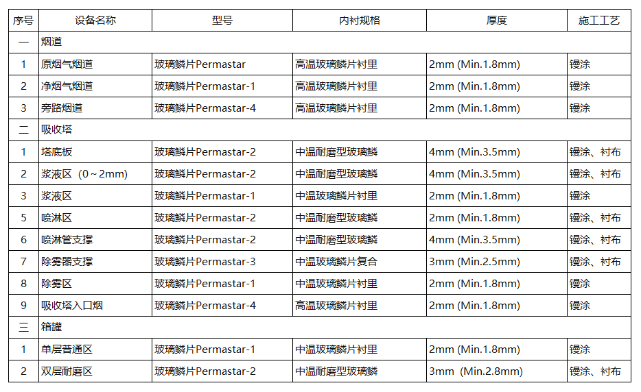 #一、施工范围 搭建脚手架、吸收塔、烟道等以前开裂脱落、空鼓、被腐蚀防腐层处理,小面积打磨、大面积喷砂,并采用乙烯基鳞片胶泥镘涂工艺、玻璃钢工艺及耐磨胶泥工艺防腐。 工作温度:60-180℃ #二、腐蚀情况 火电厂烟气中含有SO2、NOx、HF、HCl等气体,脱硫系统洗涤液中含有H2SO4、HCl、HF等化学介质腐蚀溶液,含亚硫酸、微量Cl-的热蒸汽腐蚀;且含有20%左右的固体。 稀硫酸、硫酸盐或其它化合物,烟气温度也同时降低到露点以下,这就给脱硫装置带来了露点腐蚀问题。水分子及其他化学介质对衬里渗透;喷淋液对吸收塔表面的冲刷磨损;装置停车时冷凝酸的腐蚀。 装置停车时冷凝酸的腐蚀;高温烟气对烟道表面的冲刷磨损。 #三、施工组织方案 ##1.设计方案  ##2. 内衬防腐材料  #四、具体操作 ##1、环境条件: (1) 为了确保涂装质量,须严格按照说明书的规定进行施工。 (2)在大风天禁止涂装作业。 (3)在潮湿表面上不得进行涂装作业,待涂表面周围温度至少不能低于露点以上3℃,相对湿度一般不能大于85%。 (4)在气温低于5℃时,一般不进行喷涂作业(需要特使处理,后附录)。因为在这种温度下,VEGF鳞片胶泥(涂料)的固化速度明显减慢。 在气温高于30℃时,由于其中的苯乙烯挥发太快,为了避免干喷,应将无气喷涂枪尽可能接近物面进行垂直喷涂。